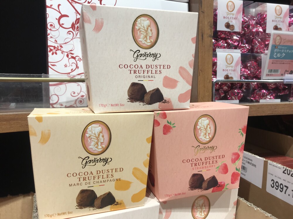ガヴァルニーの「プレミアムトリュフ」です。本当に美味しいチョコレートで、バレンタイン時期には1日300個以上売れる人気商品です。定番のココアとシャンパンに加えて、今年はストロベリーが新味として登場しました。1/5(木)まではセール特価で1箱・税込428円で販売しますので、この機会にぜひお買い求めください。