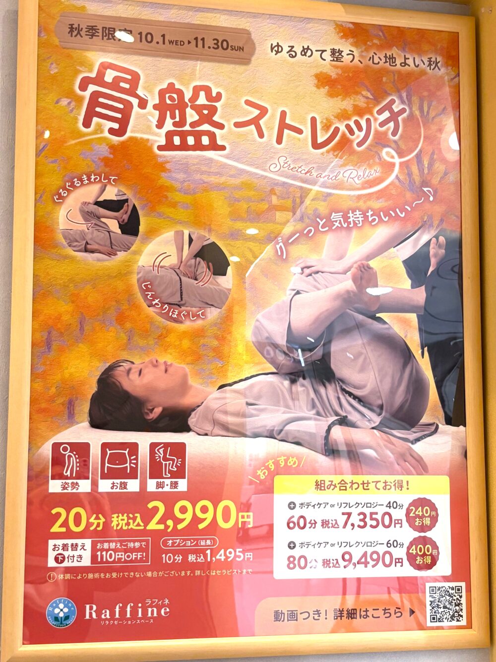 秋の限定キャンペーン「骨盤ストレッチ」は11月30日まで実施中。基本料金は20分2,990円(税込)で、オプションとして1,495円(税込)で10分延長することが可能です。