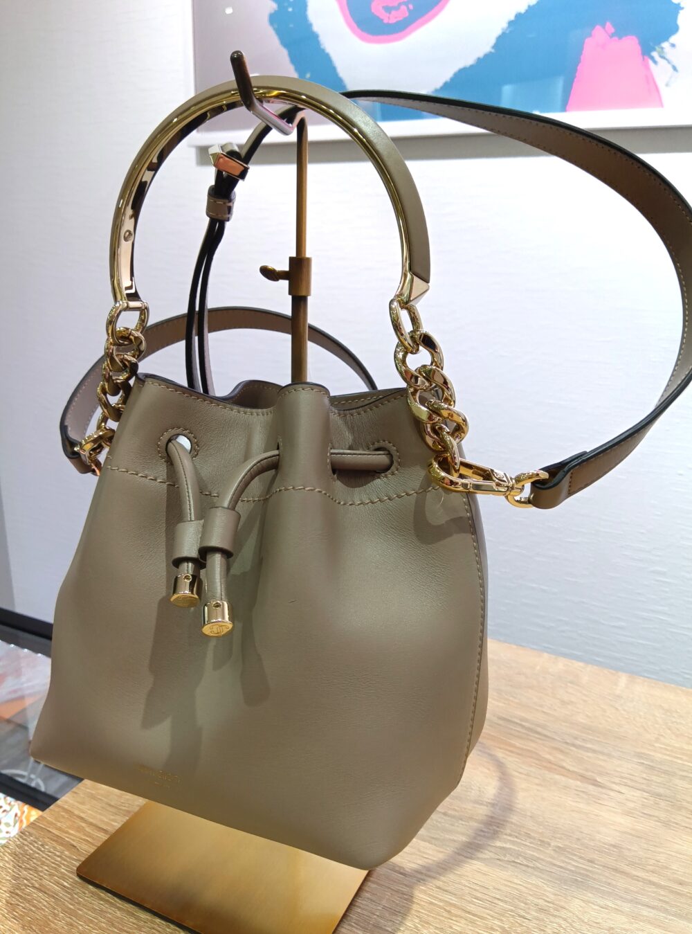 3つ目はイギリス発のラグジュアリー・アクセサリーブランド「JIMMY CHOO(ジミー チュウ)」のアイコンハンドバッグ「BON BON(ボンボン)」コレクションの2WAYバッグ(税込71,500円)。シンプルなデザインのボンボンバケットなので、フォーマルからカジュアルまで様々なファッションに合わせやすいアイテムです。