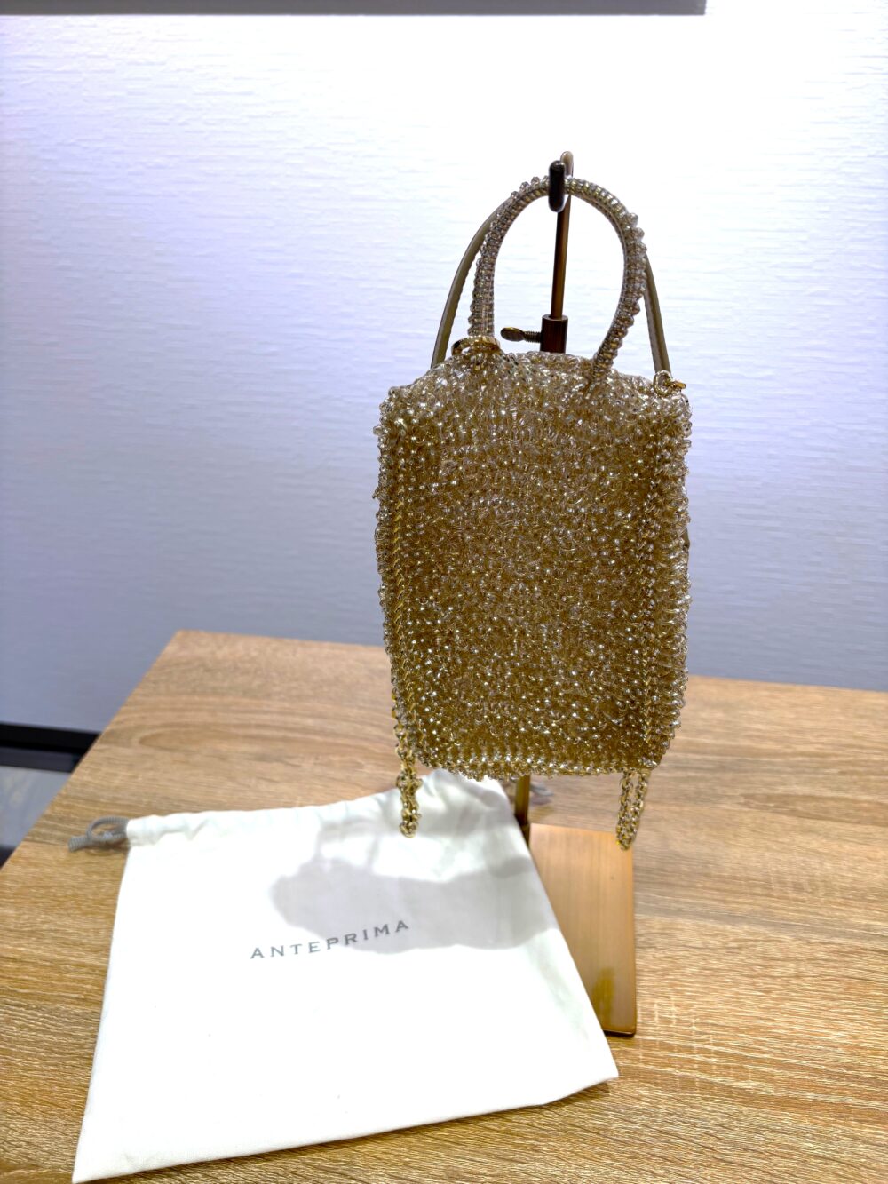 幅11センチ、高さ16センチと大きめのスマートフォンもすっぽり収納。パスケースやリップなど、日常でよく使う物を入れておくのにもちょうど良い大きさです。重量も220gと軽く、デイリー・レジャー・デートなど、さまざまなシーンにぴったりのワイヤーバッグ。長崎で状態の良いアンテプリマのリユース品は中々お目にかかれないので、今回のイチオシですね。