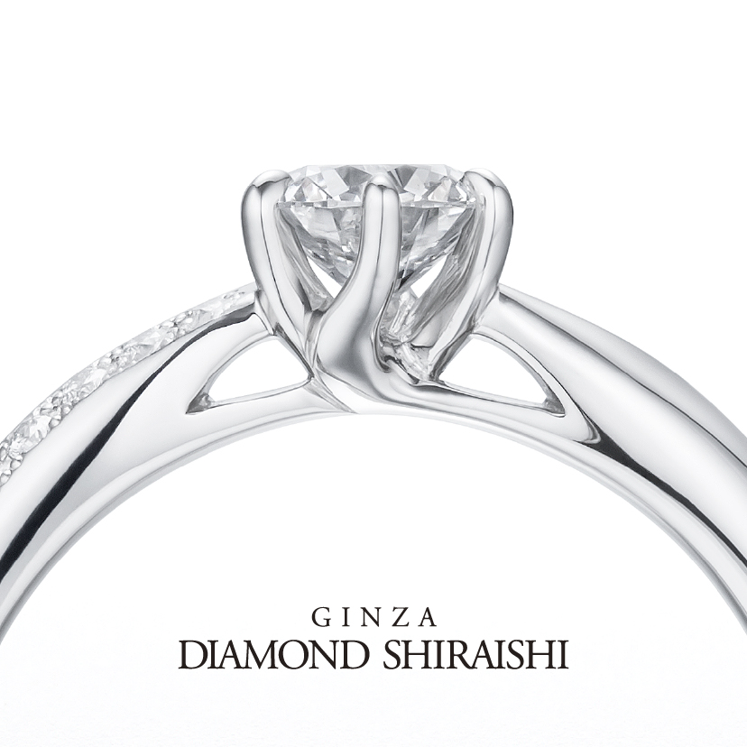 植物が美しく伸びゆく様子をイメージし、ダイヤモンドが優しく柔らかく包み込まれるようなセッティングです。センターダイヤモンドの際まで続く丸みのあるアームの立ち上がりで高さを感じにくく、着けやすいフォルムです。