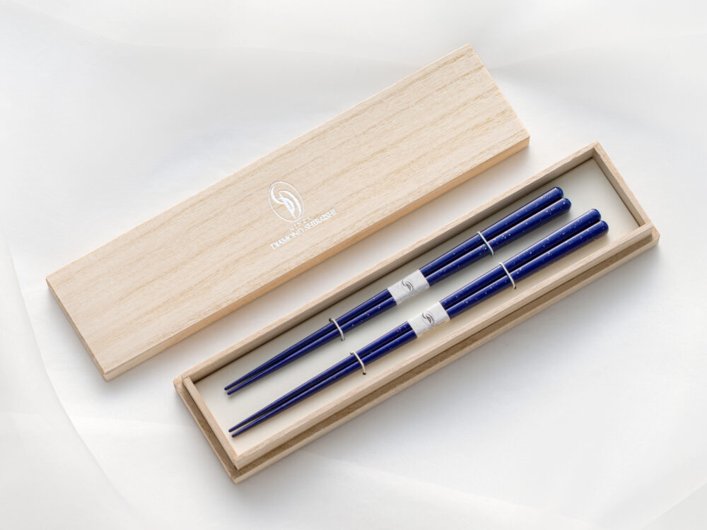 お箸専門店「箸蔵まつかん」と共同開発したオリジナル夫婦箸。ブランドコンセプトのギリシャ・エーゲ海とキラキラした輝く水面を表現しています。