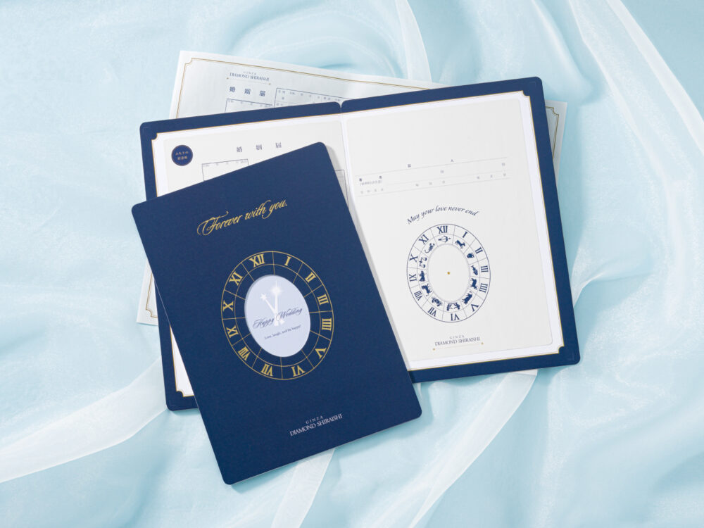 銀座本店のシンボルである時計をモチーフにした婚姻届。提出用と保管用をご用意しています。保管用は写真を貼ることも可能です。また、内側には星座がちりばめられた時計のイラストが描かれており、上にリングを置いて写真を撮影することもできます。おふたりがご夫婦になられる特別なアイテムが、素敵な思い出となるようにご用意いたしております。